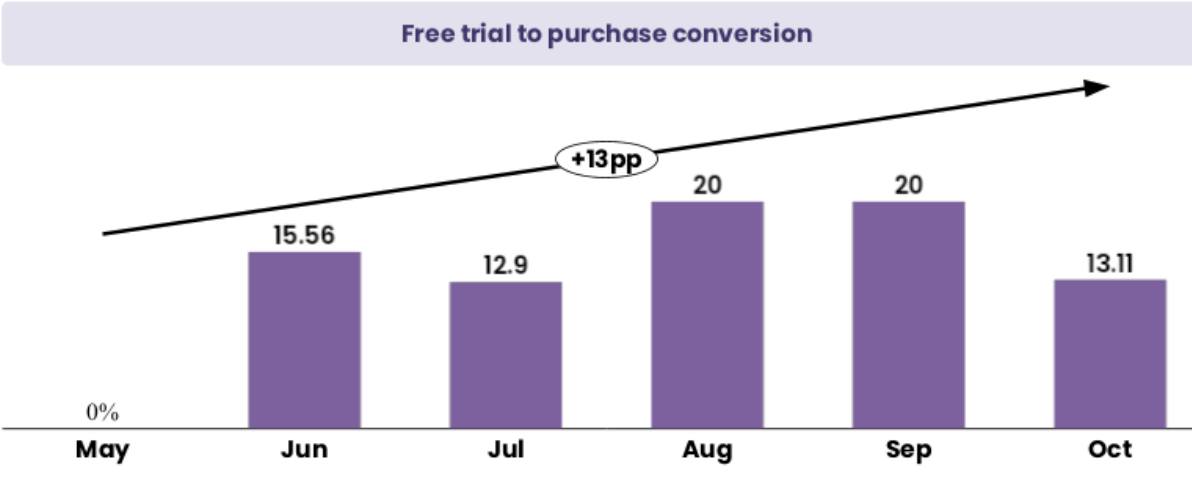 Our free-trial–to-purchase conversion rate continues to validate the strength of our value proposition once users experience the product. After launching paid plans in June, conversion reached 15.56% and has consistently remained in the double-digit range, peaking at 20% in both August and September. This represents a 13-percentage-point improvement from launch and confirms that users who complete their trial see enough value to continue as paying customers. While October shows a slight dip to 13.11%, this is within expected variability as we scale acquisition and test new segments. Overall, these results reinforce that our product converts well when engagement is strong, and that optimizing the early part of the user journey will directly amplify revenue conversion downstream.
